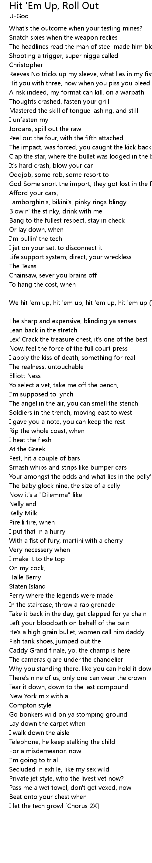 We hit 'em up, hit 'em up, hit 'em up, hit 'em up (Then ride out, ride out, ride out, ride out) [U-God] |