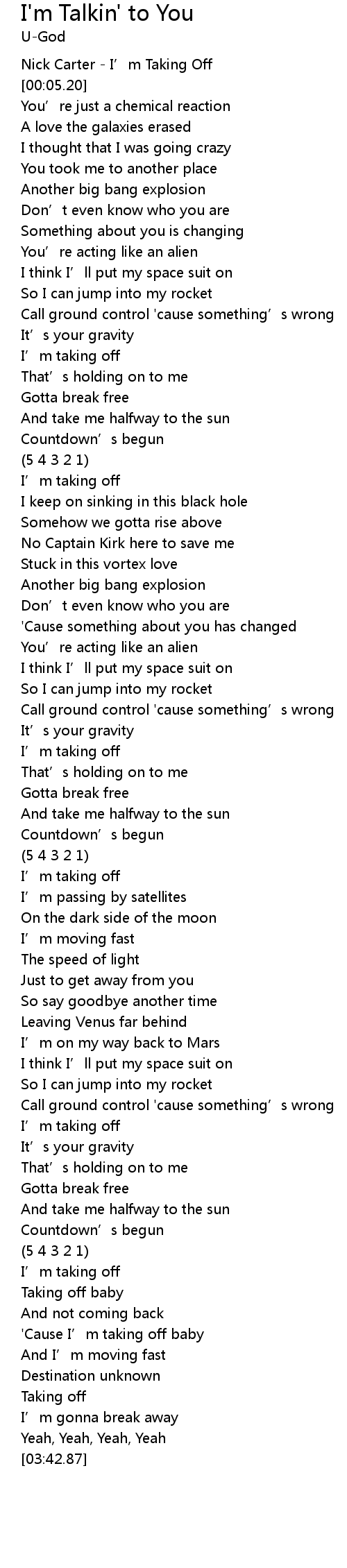 | [02:00.56] | I' m taking off |