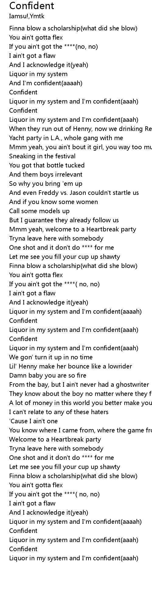 | [00:27.60] | Liquor in my system and I'm confident(aaah) |