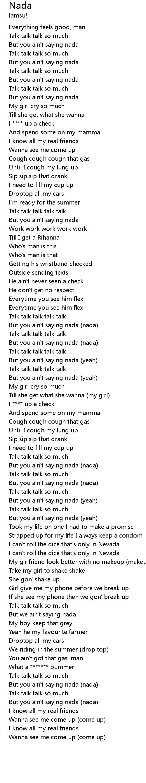| [01:20.14] | But you ain't saying nada (nada) |
