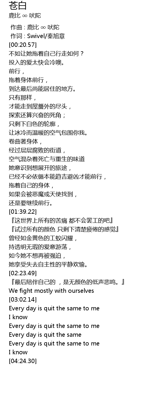 | [01:50.67] | 『试过所有的颜色 只剩下清楚疲倦的感觉』 |