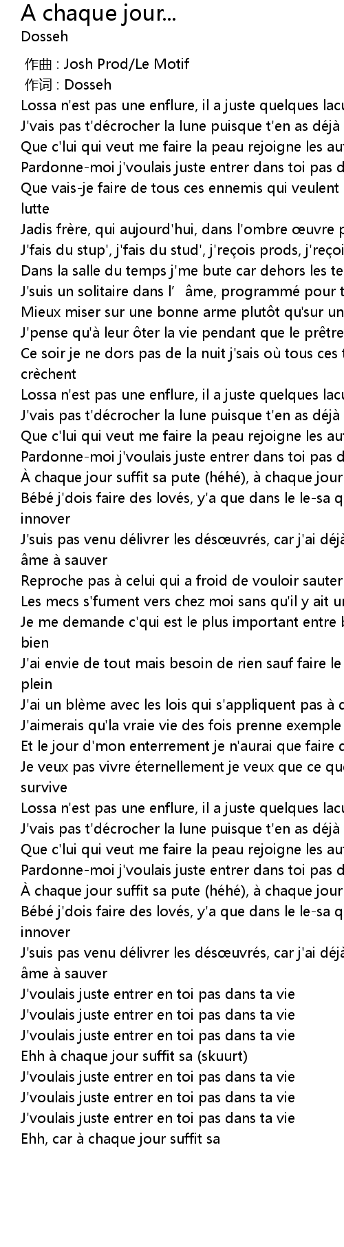 | [01:20.69] | À chaque jour suffit sa pute hé hé, à chaque jour suffit sa ehh |
