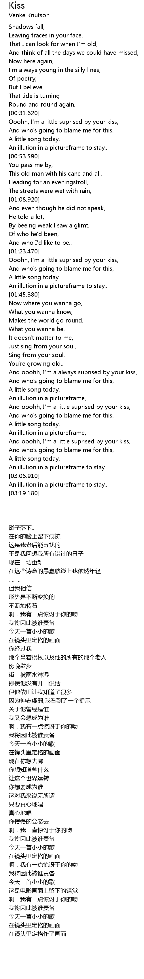 | [02:06.0] | And ooohh, I' m a always suprised by your kiss, |