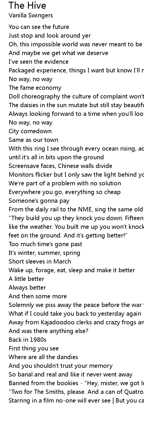 "They build you up they knock you down. Fifteen minutes counting down. Changes like the weather. You built me up you won't knock me down - I'm keeping both feet on the ground. And it's getting better!"