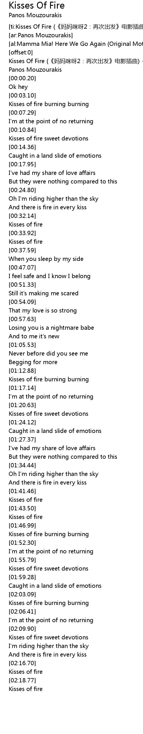 | [00:00.10] | Kisses Of Fire ma ma mi ya 2: zai ci chu fa dian ying cha qu Panos Mouzourakis |
