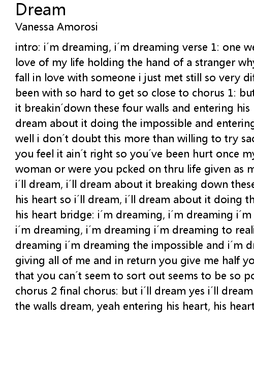 | intro: i m dreaming, i m dreaming verse 1: one week to another leaving the love of my life holding the hand of a stranger why does this feel right so i fall in love with someone i just met still so very different from the men i ve been with so hard to get so close to chorus 1: but i ll dream, i ll drem about it breakin down these four walls and entering his heart so i ll dream, i ll dream about it doing the impossible and entering his heart, his heart verse 2: well i don t doubt this more than willing to try sacrifice things forever but you feel it ain t right so you ve been hurt once mybe been hurt twice was it a woman or were you pcked on thru life given as much as i can give chorus 2: but i ll dream, i ll dream about it breaking down these four walls and entering his heart so i ll dream, i ll dream about it doing the impossible and entering his heart bridge: i m dreaming, i m dreaming i m dreaming the impossible and i m dreaming, i m dreaming i m dreaming to reality i m dreaming, i m dreaming i m dreaming the impossible and i m dreaming, dreaming verse 3: i m giving all of me and in return you give me half you say you got your problems that you can t seem to sort out seems to be so pointless that i stay repeat chorus 2 final chorus: but i ll dream yes i ll dream about it breaking down the walls dream, yeah entering his heart, his heart |