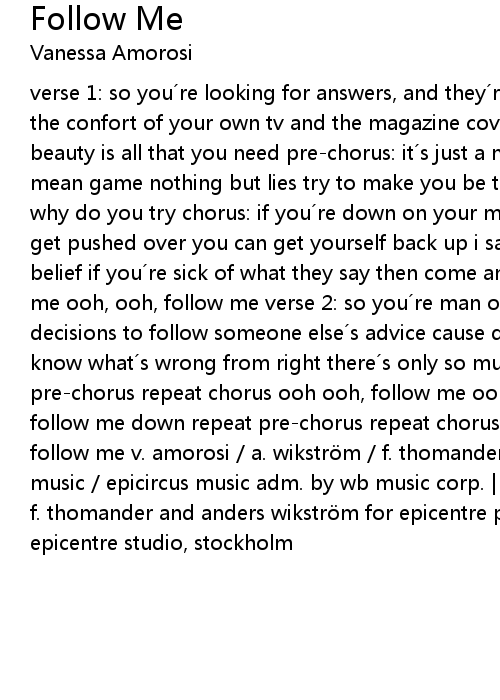 | verse 1: so you´re looking for answers, and they´re selling your choices in the confort of your own tv and the magazine covers, they made you discover beauty is all that you need pre-chorus: it´s just a mean game nothing but a mean game nothing but lies try to make you be things tell you how to see things why do you try chorus: if you´re down on your money down on your luck if you get pushed over you can get yourself back up i said down on respect and down on belief if you´re sick of what they say then come and follow me ooh ooh, follow me ooh, ooh, follow me verse 2: so you´re man on a mission who makes the decisions to follow someone else´s advice cause deep down inside you don´t know what´s wrong from right there´s only so much money can buy repeat pre-chorus repeat chorus ooh ooh, follow me ooh ooh, follow me why don´t you follow me down repeat pre-chorus repeat chorus (x2) ooh ooh, follow me ooh ooh, follow me v. amorosi / a. wikström / f. thomander | published by universal music / epicircus music adm. by wb music corp. | produced, recorded and mixed by f. thomander and anders wikström for epicentre productions. | recorded at the epicentre studio, stockholm |