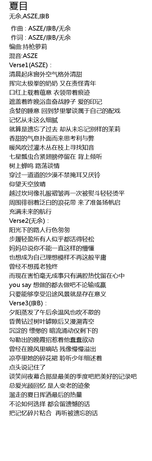 | [00:00.000] | 作曲 : ASZE/康B/无余 |