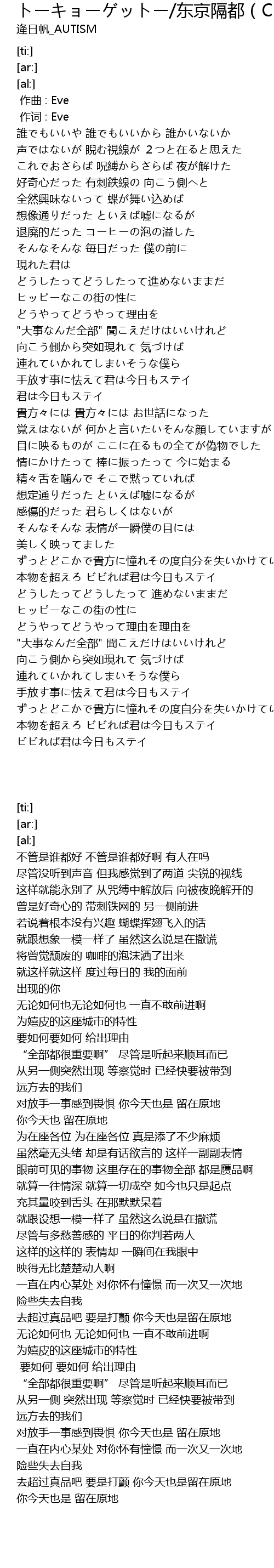 | Song | トーキョーゲットー/东京隔都(Cover 初音ミク) |