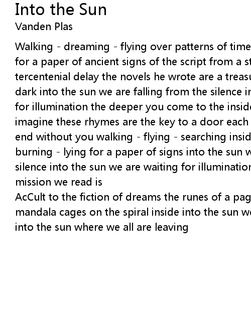 Walking - dreaming - flying over patterns of time searching - lying - burning for a paper of ancient signs of the script from a stranger had a long tercentenial delay the novels he wrote are a treasure a meander down from the dark into the sun we are falling from the silence into the sun we are waiting for illumination the deeper you come to the inside words built up a new universe imagine these rhymes are the key to a door each term is a pathway erased in the end without you walking - flying - searching inside of these lines dreaming - burning - lying for a paper of signs into the sun we are falling from the silence into the sun we are waiting for illumination a view to the source of the mission we read is |