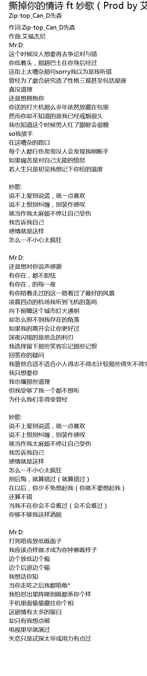 | Song | 撕掉你的情诗 ft 妙歌(Prod by 艾福杰尼) |