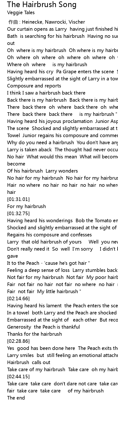 | [02:44.71] | Take care take care don't dare not care take care nice hair no fair take care take care of my hairbrush |