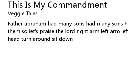 | Father abraham had many sons had many sons had father abraham and i am one of them so let's praise the lord right arm left arm left foot right foot node your head turn around sit down |