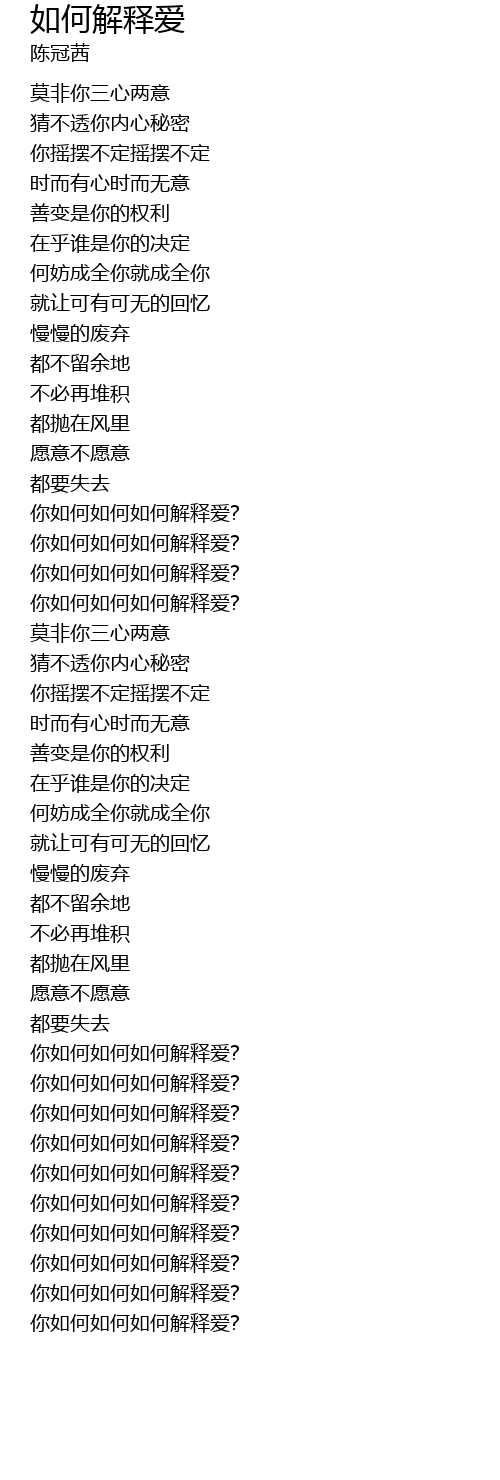 | [03:41.47] | nǐ rú hé rú hé rú hé jiě shì ài? |