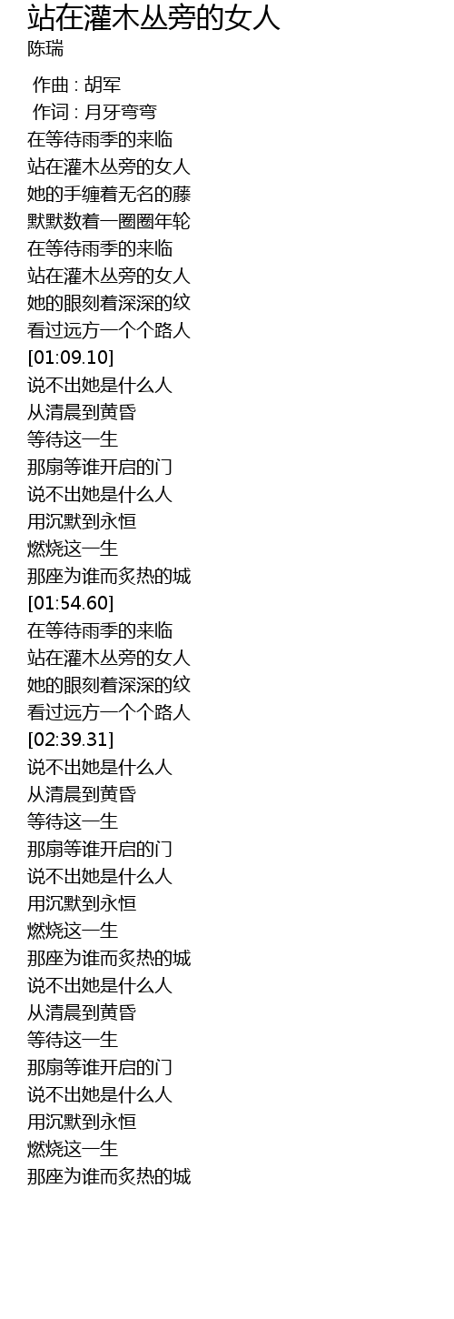 | [02:21.24] | 站在灌木丛旁的女人 |