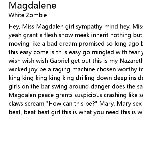 Hey, Miss Magdalen girl sympathy mind hey, Miss Magdalen girl power. Power off, yeah grant a flesh show meek inherit nothing but death song queen sex go-go moving like a bad dream promised so long ago blessed art thou among women is this easy come is thi s easy go mingled with fear you get what you wish wish wish wish wish Gabriel get out this is my Nazareth wicked joy trembling town wicked joy be a raging machine chosen worthy to explode a king a king king king king king king king king drilling down deep inside heartache tests the pain girls on the bar swing around danger does the sam Magdalen Magdalen Magdalen Magdalen peace grants suspicious crashing like some animals southern terror claws scream "How can this be?" Mary, Mary sex machine Mary. Mary r aging on beat, beat beat girl this is what you need this is what you need now now now