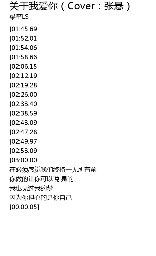| [01:17.38][03:00.00][03:41.23][03:48.44][03:55.14][04:01.91][04:08.60][04:15.54][04:22.44] | wo ai ni |