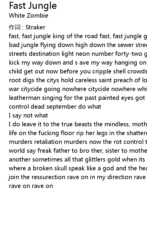 | fast, fast jungle king of the road fast, fast jungle got a suicide machine big bad jungle flying down high down the sewer streets sailing down the river streets destination light neon number forty-two grind and move my way found and kick my way down and s ave my way hanging on psychic ride sliding down fridays child get out now before you cripple shell crowds a carbon long while a twisted root digs the citys hold careless saint preach of love modern trash scream for war citycide going nowhere citycide nowhere which ung end in a dragstrip crash leatherman singing for the past painted eyes got a face to remember king of control dead september do what | |