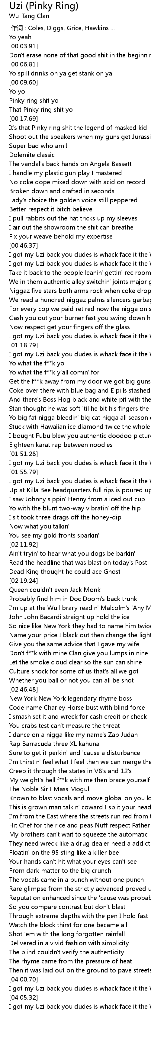 | [04:01.21] | I got my Uzi back you dudes is whack face it the Wu is back |