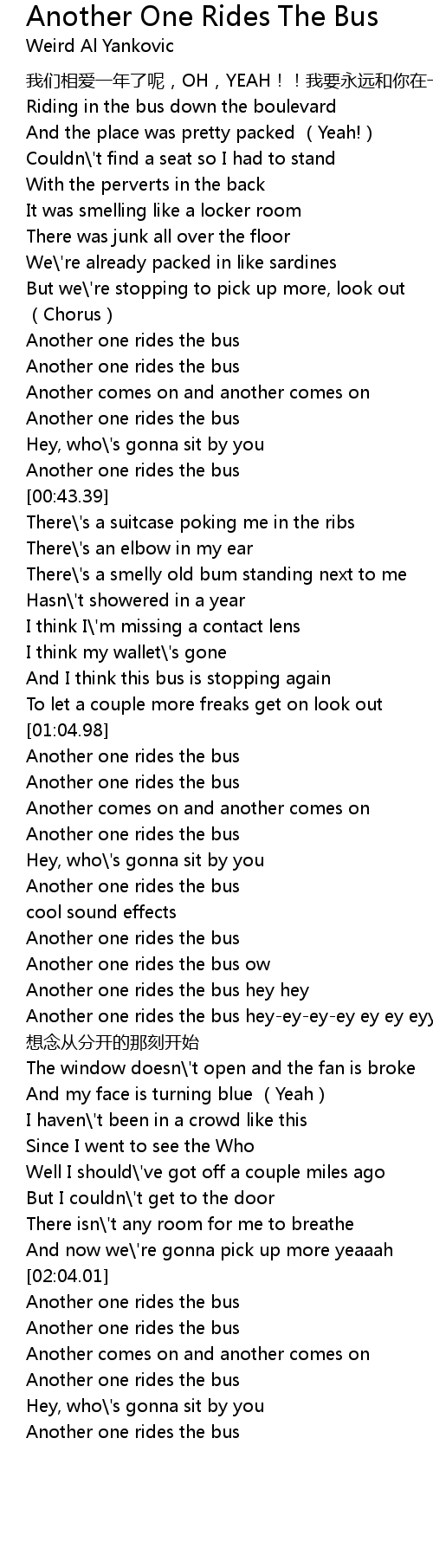 | [01:40.19] | Another one rides the bus hey-ey-ey-ey ey ey eyyyyyy |