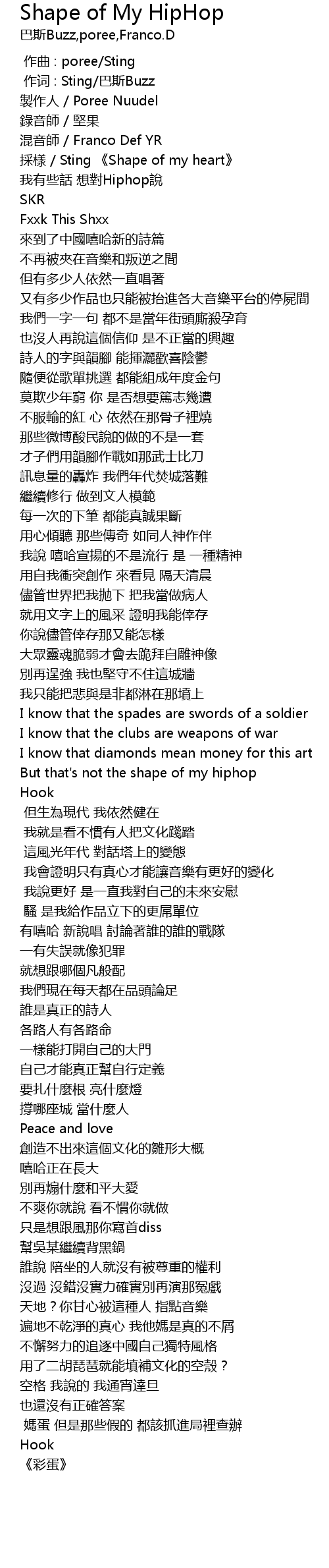 | [00:24.00] | 採樣 / Sting 《Shape of my heart》 |