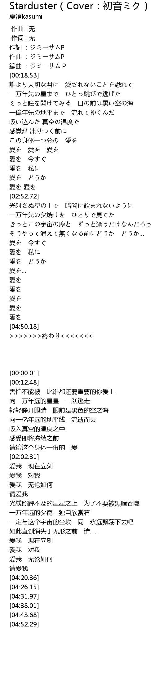 | [03:30.42] | きっとこの宇宙の塵と ずっと漂うだけなんだろう |