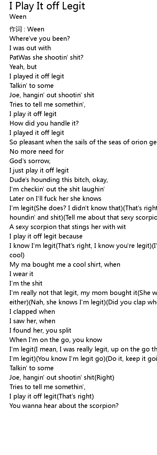 | I' m really not that legit, my mom bought it She wasn' t playing it off legit either Nah, she knows I' m legit Did you clap when you saw her? | |