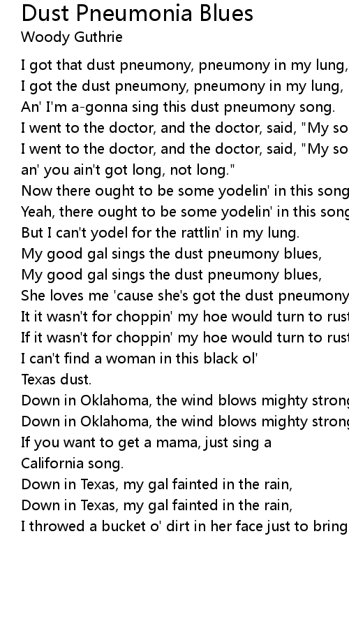 An' I'm a-gonna sing this dust pneumony song. |