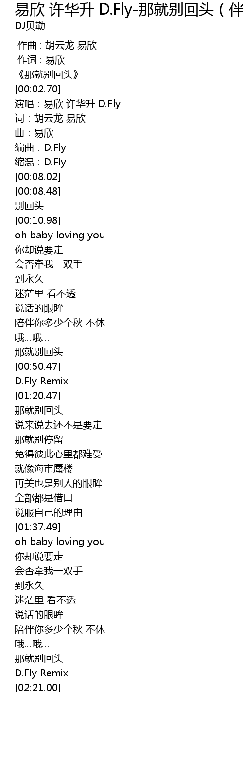 | Song | 易欣 许华升 D.Fly-那就别回头(伴奏)(D.Fly Remix) |