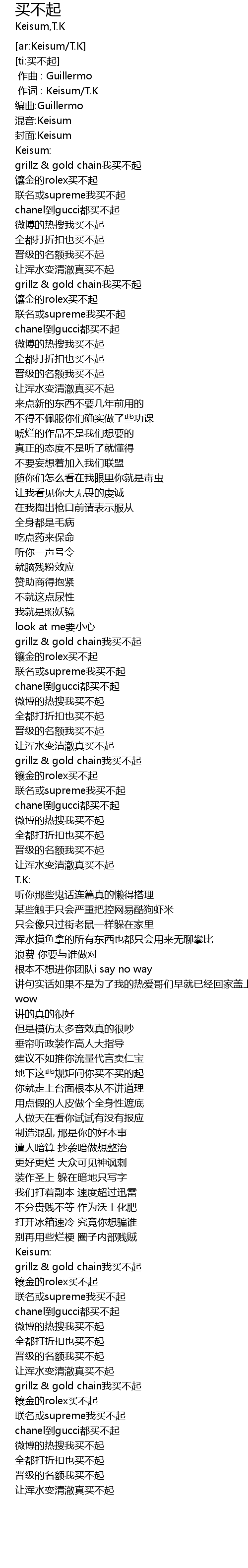| [00:18.42] | grillz gold chain wǒ mǎi bu qǐ |