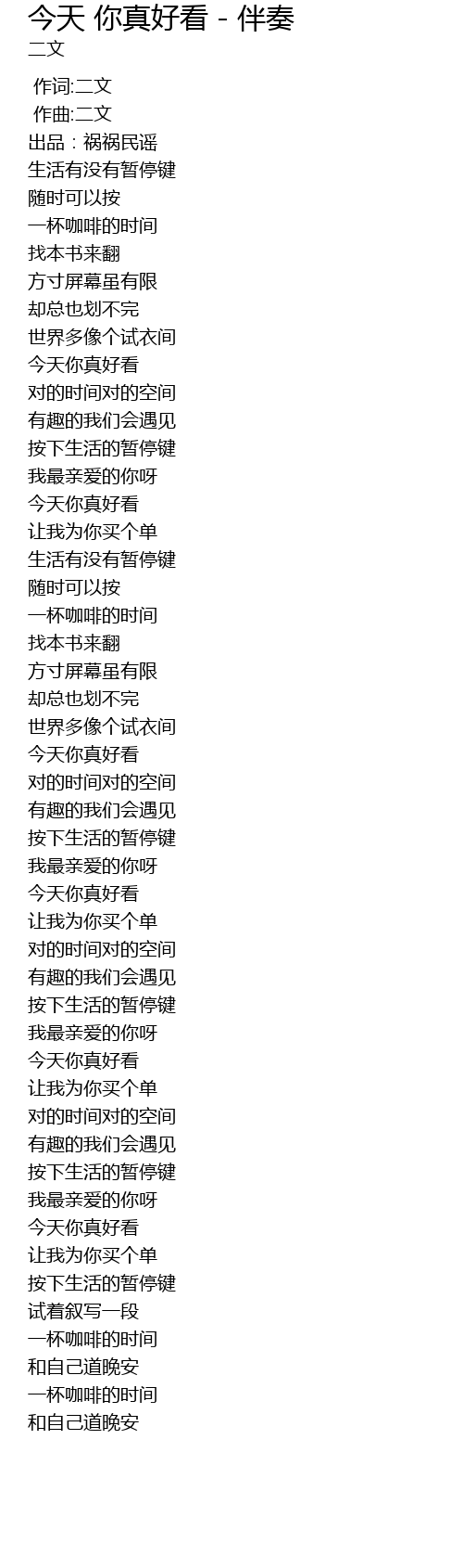 | [02:34.65] | jīn tiān nǐ zhēn hǎo kàn |