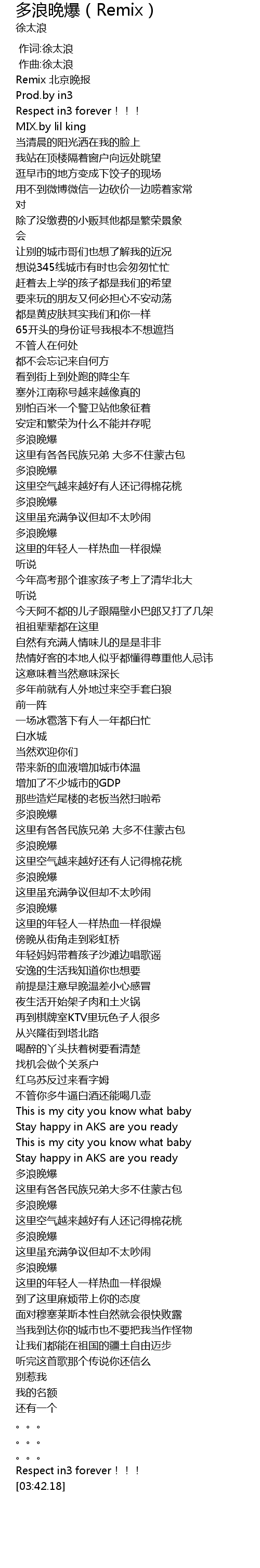 | [00:42.18] | 让别的城市哥们也想了解我的近况 |
