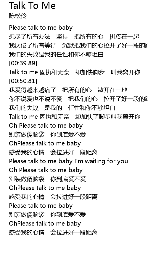 | [00:41.01] | Talk to me 固执和无奈 却加快脚步 叫我离开你 |