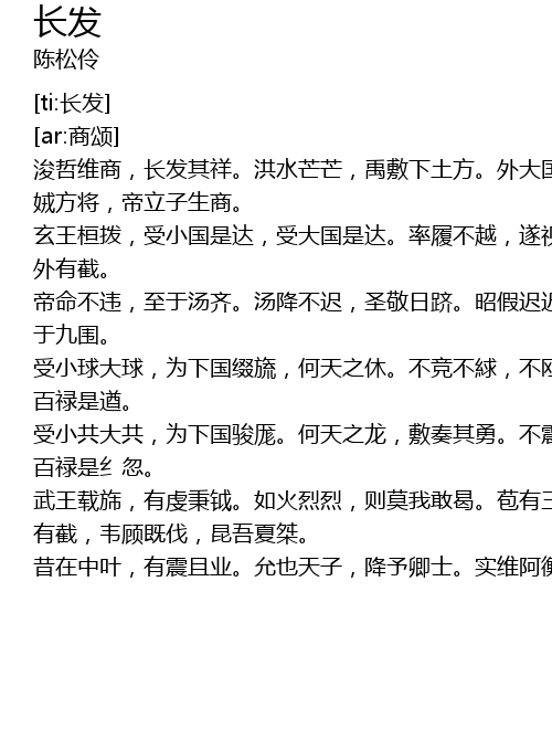 | [00:03.512] | 浚哲维商,长发其祥。洪水芒芒,禹敷下土方。外大国是疆,幅陨既长。有 |
