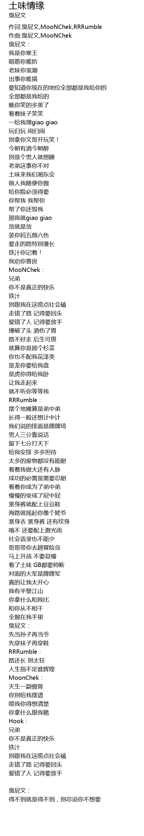 | 作词:臭屁文,MooNChek,RRRumble | |