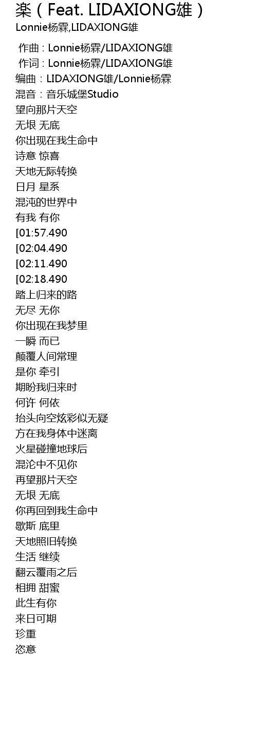 | [00:05.490] | 编曲:LIDAXIONG雄/Lonnie杨霖 |