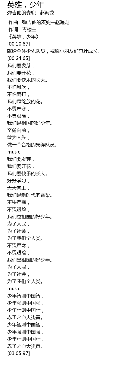 | [00:15.12] | 献给全体少先队员,祝愿小朋友们茁壮成长。 |