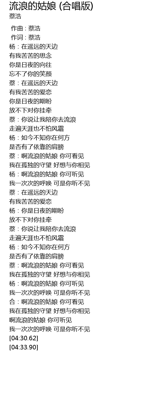 | [01:31.83] | 蔡:啊流浪的姑娘 你可看见 |
