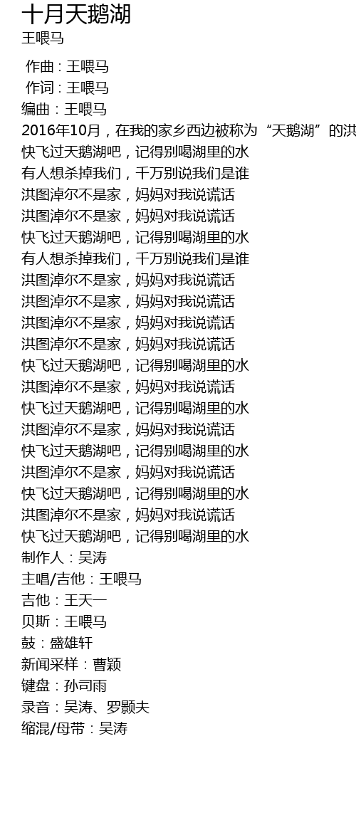 | [00:37.58] | 2016年10月,在我的家乡西边被称为“天鹅湖”的洪图淖尔,二百多只天鹅和绿头鸭被投毒杀害 |