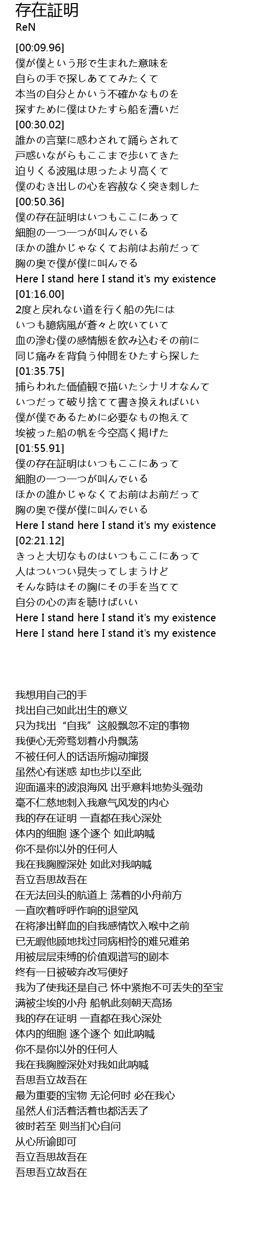 | [02:42.31] | Here I stand here I stand it's my existence |