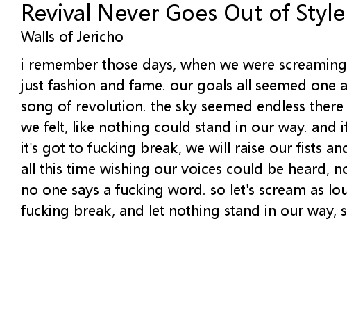 i remember those days, when we were screaming for change. when it was more than just fashion and fame. our goals all seemed one and the same, and we sang the song of revolution. the sky seemed endless there was no stopping us. and i felt, we felt, like nothing could stand in our way. and if i scream as loud as i can, it's got to fucking break, we will raise our fists and fight for our own place. all this time wishing our voices could be heard, now we finally have a voice and no one says a fucking word. so let's scream as loud as we can and make it fucking break, and let nothing stand in our way, stand in our way.