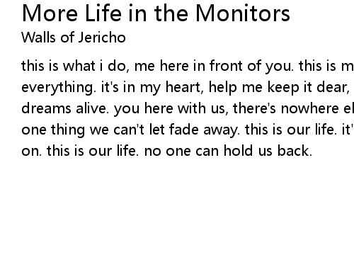 | this is what i do, me here in front of you. this is my life, this is my everything. it's in my heart, help me keep it dear, and i will fight to keep my dreams alive. you here with us, there's nowhere else i want to be. this is the one thing we can't let fade away. this is our life. it's what drives us to go on. this is our life. no one can hold us back. |