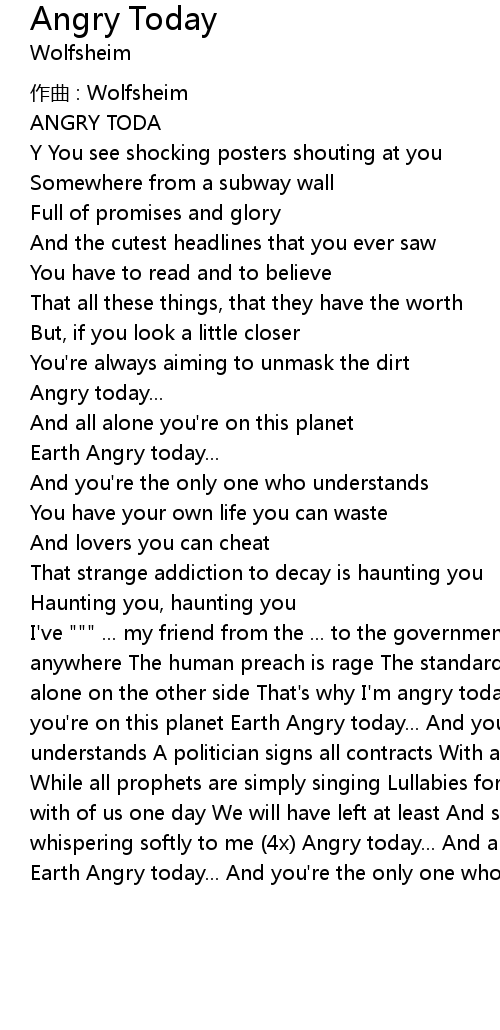 | I' ve """ ... my friend from the ... to the government Here and there and anywhere The human preach is rage The standard could advance you While standing alone on the other side That' s why I' m angry today Angry today... And all alone you' re on this planet Earth Angry today... And you' re the only one who understands A politician signs all contracts With a light expression on his face While all prophets are simply singing Lullabies for the human race When love is with of us one day We will have left at least And stepmother industry' s whispering softly to me 4x Angry today... And all alone you' re on this planet Earth Angry today... And you' re the only one who understands Angry... |