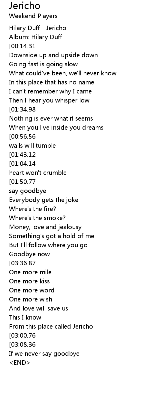 | [00:43.86][01:34.98] | One more mile to Jericho |