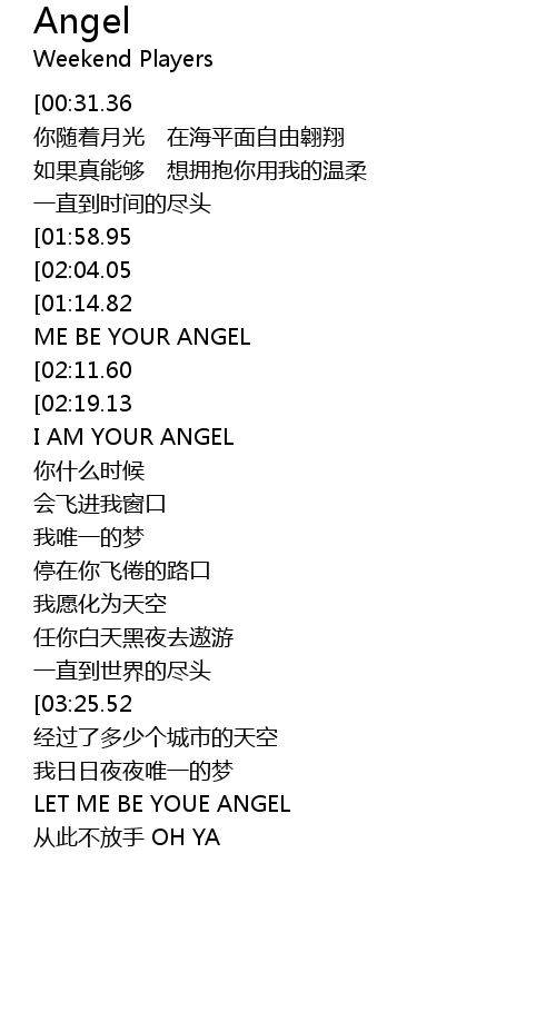 | [02:25.85][03:25.52][03:55.56][04:26.21] | I AM YUOR ANGEL |