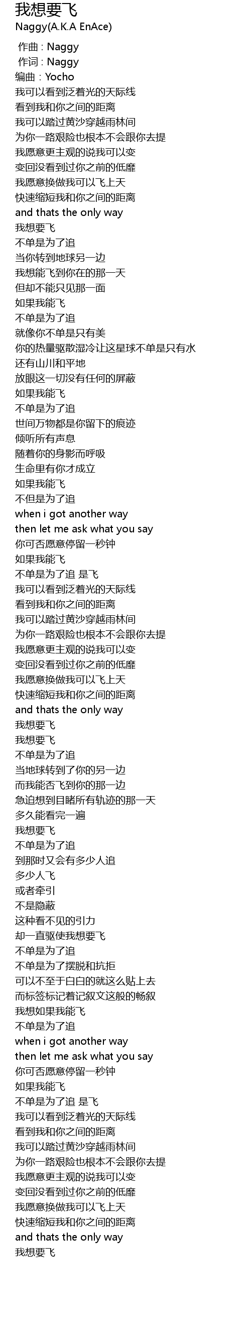 | [02:01.08] | wǒ xiǎng yào fēi |