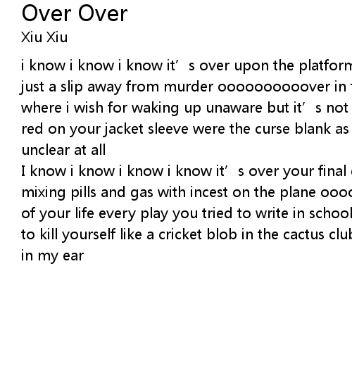 | I know i know i know i know it' s over your final descent ick ick ick ick ick mixing pills and gas with incest on the plane ooooover folded up the last year of your life every play you tried to write in school venice is the right place to kill yourself like a cricket blob in the cactus club pass away and chirping in my ear |