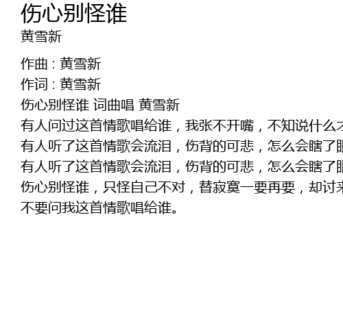 | 伤心别怪谁 词曲唱 黄雪新 有人问过这首情歌唱给谁,我张不开嘴,不知说什么才对, 有人听了这首情歌会流泪,伤背的可悲,怎么会瞎了眼分不清是与非?!伤心别怪谁,只怪自己不对,替寂寞一要再要,却讨来最痛的滋味,伤心别怪谁,只怪自己不对,Sorry,Sorry,Sorry,我不该偷干你的泪。 有人听了这首情歌会流泪,伤背的可悲,怎么会瞎了眼分不清是与非?!伤心别怪谁,只怪自己不对,替寂寞一要再要,却讨来最痛的滋味,伤心别怪谁,只怪自己不对,Sorry,Sorry,Sorry,我不该偷干你的泪。 伤心别怪谁,只怪自己不对,替寂寞一要再要,却讨来最痛的滋味,伤心别怪谁,只怪自己不对,Sorry,Sorry,Sorry,我不该偷干你的泪。 不要问我这首情歌唱给谁。 |