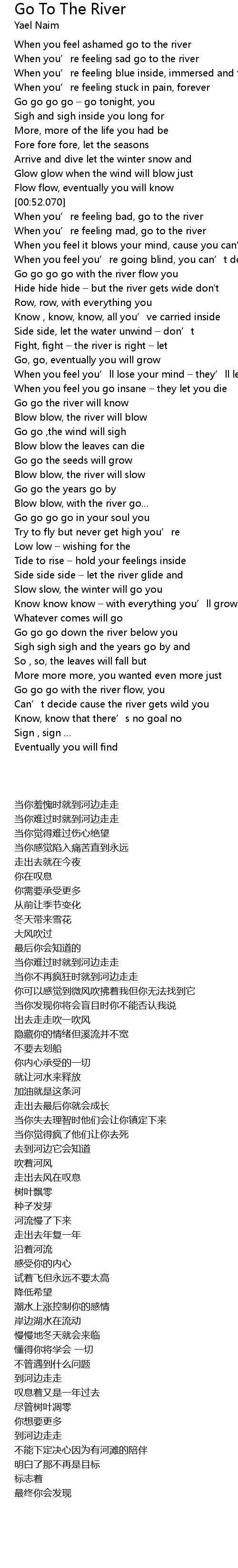 | [00:10.430] | When you' re feeling sad go to the river |