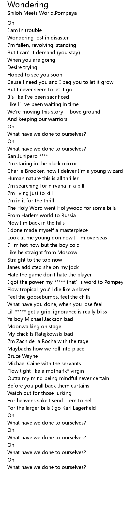| [03:00.40] | What have we done to ourselves? |